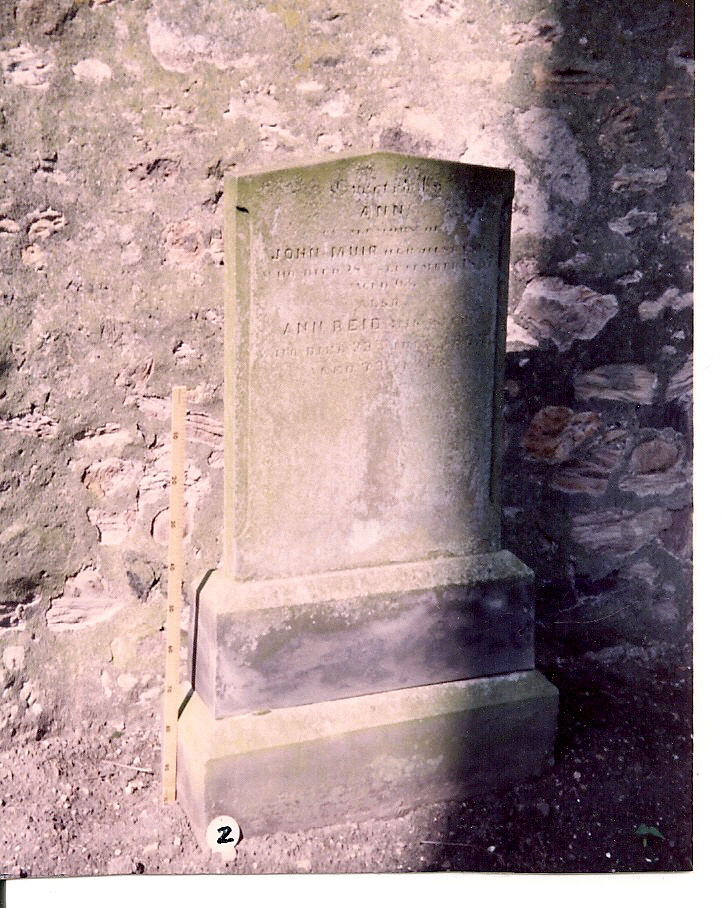 Inscription 1 | ERECTED BY ANN IN MEMORY OF JOHN MUIR HER HUSBAND WHO DIED 28TH SEPTEMBER 1857 AGED 63 |