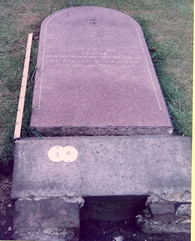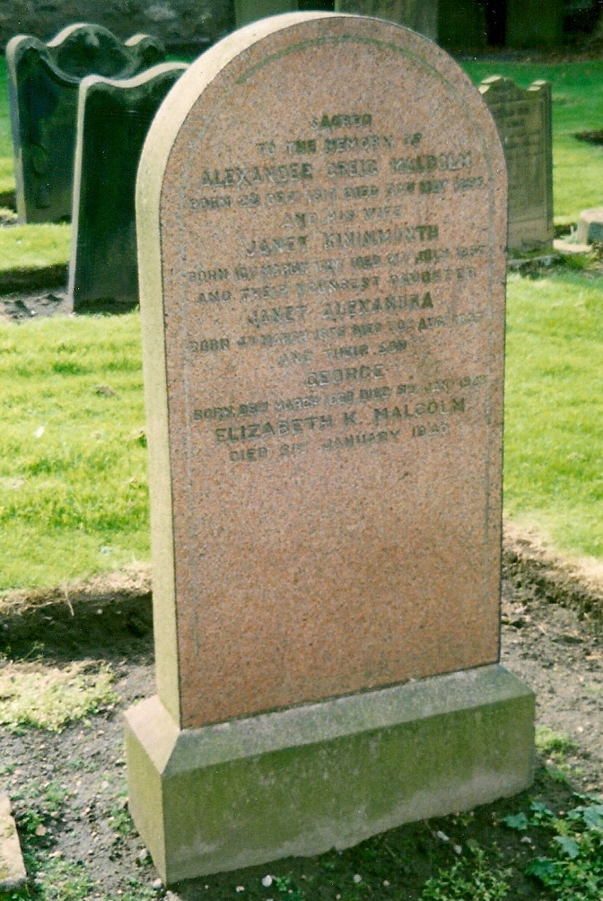 Inscription 1 | SACRED TO THE MEMORY OF ALEXANDER GREIG MALCOLM BORN 2nd DECR 1813 DIED 30TH MAY 1895 AND HIS WIFE JANET KININMONTH BORN 16TH MAR 1836 DIED 21ST JUL 1897 AND THEIR YOUNGEST DAUGHTER JANET ALEXANDRA BORN 4TH MAR 1875 DIED 30TH AUG 1897 AND THEIR SON GEORGE |