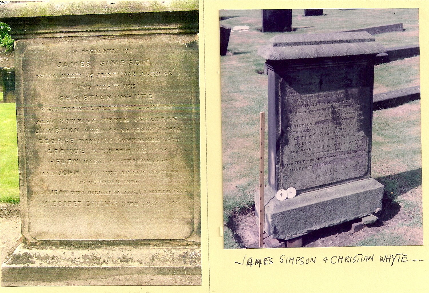 Inscription 1 | IN MEMORY OF JAMES SIMPSON WHO DIED 18 JUNE 1852 AGED 82 AND HIS WIFE CHRISTIAN WHYTE WHO DIED 12 JUNE 1841 AGED 64 ALSO FOUR OF THEIR CHILDREN CHRISTIAN DIED 19 NOVEMBER 1815 GEORGE DIED 16 NOVEMBER 1820 GEORGE DIED 10 JULY 1828 |
