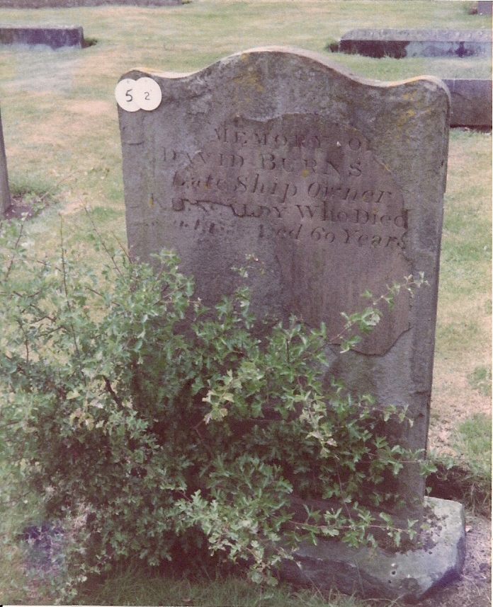 Inscription 1 | B ----- 1819 (on top edge) -- MEMORY OF DAVID BURNS LATE SHIP OWNER K------LDY WHO DIED 30.10.1830 (from old record 155) --ED 60 YEARS |
