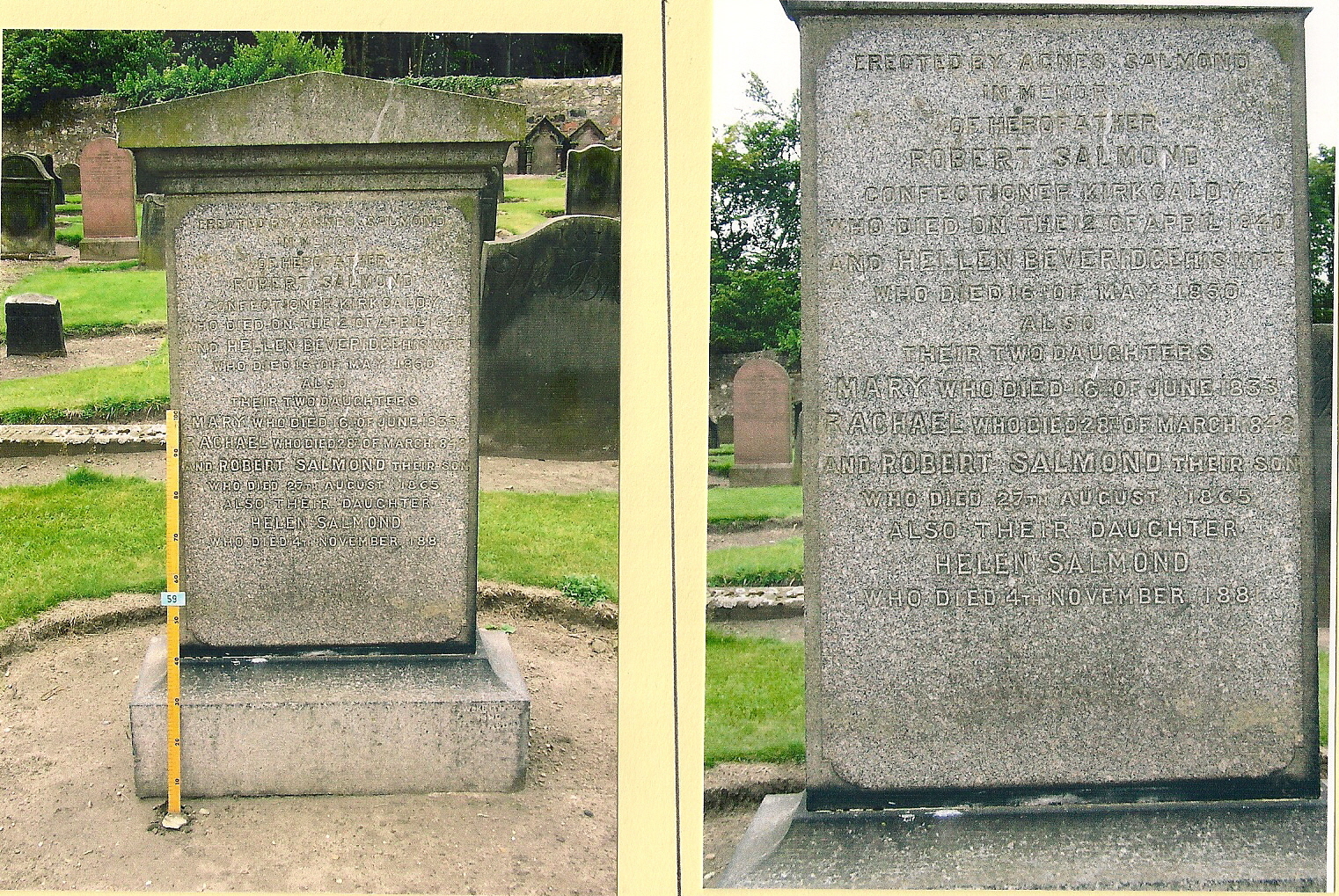 Inscription 1 | ERECTED BY AGNES SALMOND IN MEMORY OF HER FATHER ROBERT SALMOND CONFECTIONER KIRKCALDY WHO DIED ON THE 12TH OF APRIL 1840 AND HELLEN BEVERIDGE HIS WIFE WHO DIED 16TH OF MAY 1860 |