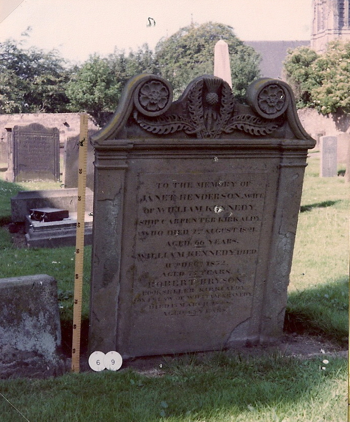 Inscription 1 | TO THE MEMORY OF JANET HENDERSON, WIFE OF WILLIAM KENNEDY, SHIP CARPENTER KIRKALDY. WHO DIED 2ND AUGUST 1821 AGED 66 YEARS - WILLIAM KENNEDY, DIED 11TH DECR. 1832 AGED 75 YEARS - ROBERT BRYSON BOOKSELLER KIRKCALDY |