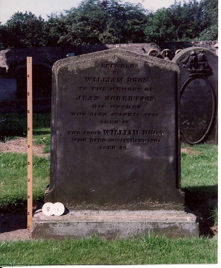 Inscription 1 | ERECTED BY WILLIAM DRON TO THE MEMORY OF JEAN ROBERTSON HIS MOTHER WHO DIED 4TH APRIL 1852 AGED 70 THE ABOVE WILLIAM DRON WHO DIED 30TH JANUARY 1861 AGED 49. |