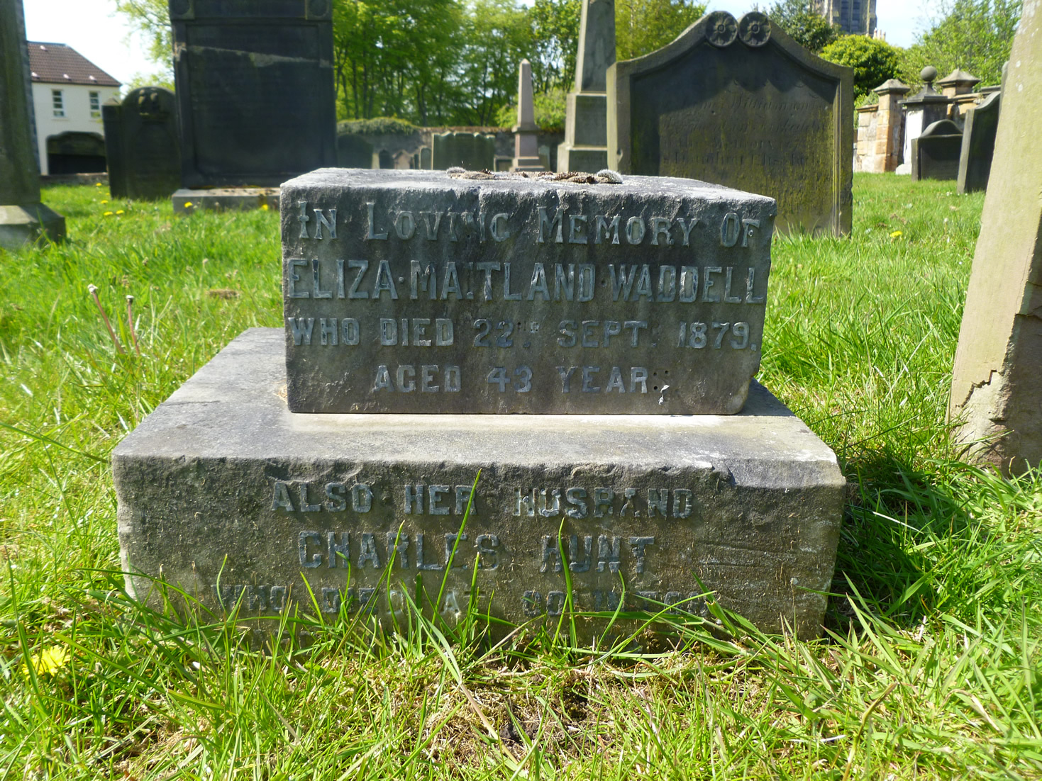 Inscription 1 | IN LOVING MEMORY OF ELIZA MAITLAND WADDELL WHO DIED 22ND SEPT 1879 AGED 43 YEARS ALSO HER HUSBAND CHARLES HUNT WHO DIED AT COLINTON 19TH MARCH 1905 AGED 74 YEARS |
