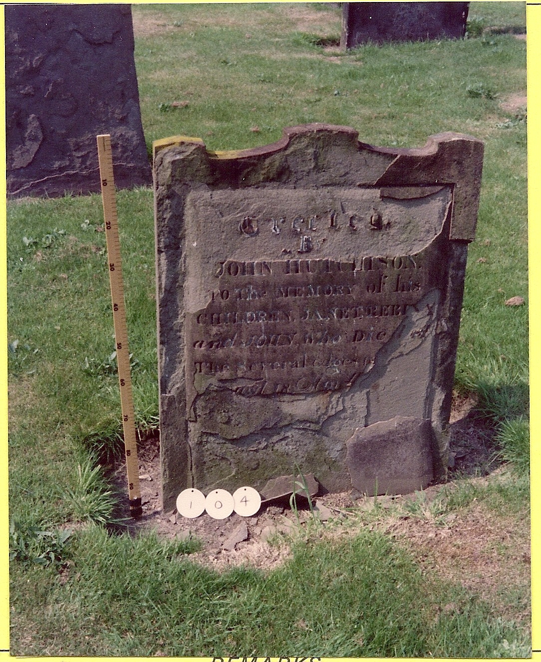 Inscription 1 | ERECTED BY JOHN HUTCHISON TO THE MEMORY OF HIS CHILDREN. JANET REB--- AND JOHN. WHO DIED --- THE SEVERAL AGES OF --- AND 18 MONTHS |