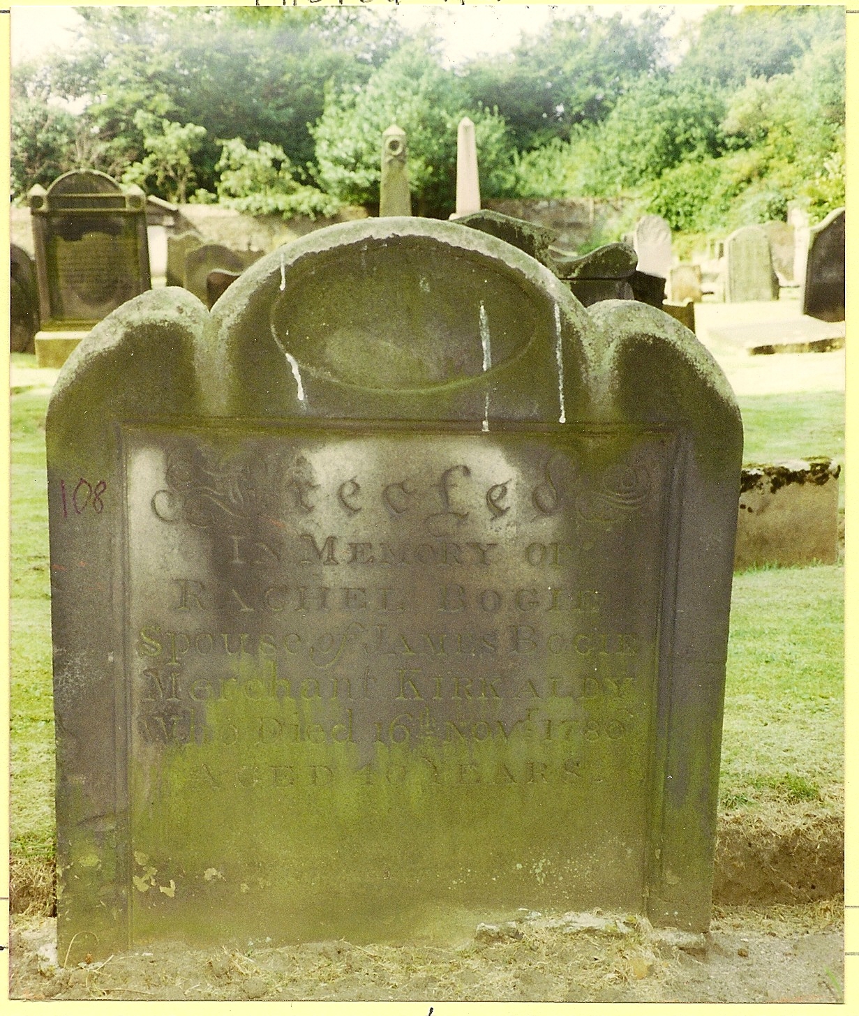 Inscription 1 | ERECTED IN MEMORY OF RACHEL BOGIE SPOUSE OF JAMES BOGIE MERCHANT KIRKALDY WHO DIED 16TH NOVR. 1786 AGED 40 YEARS |