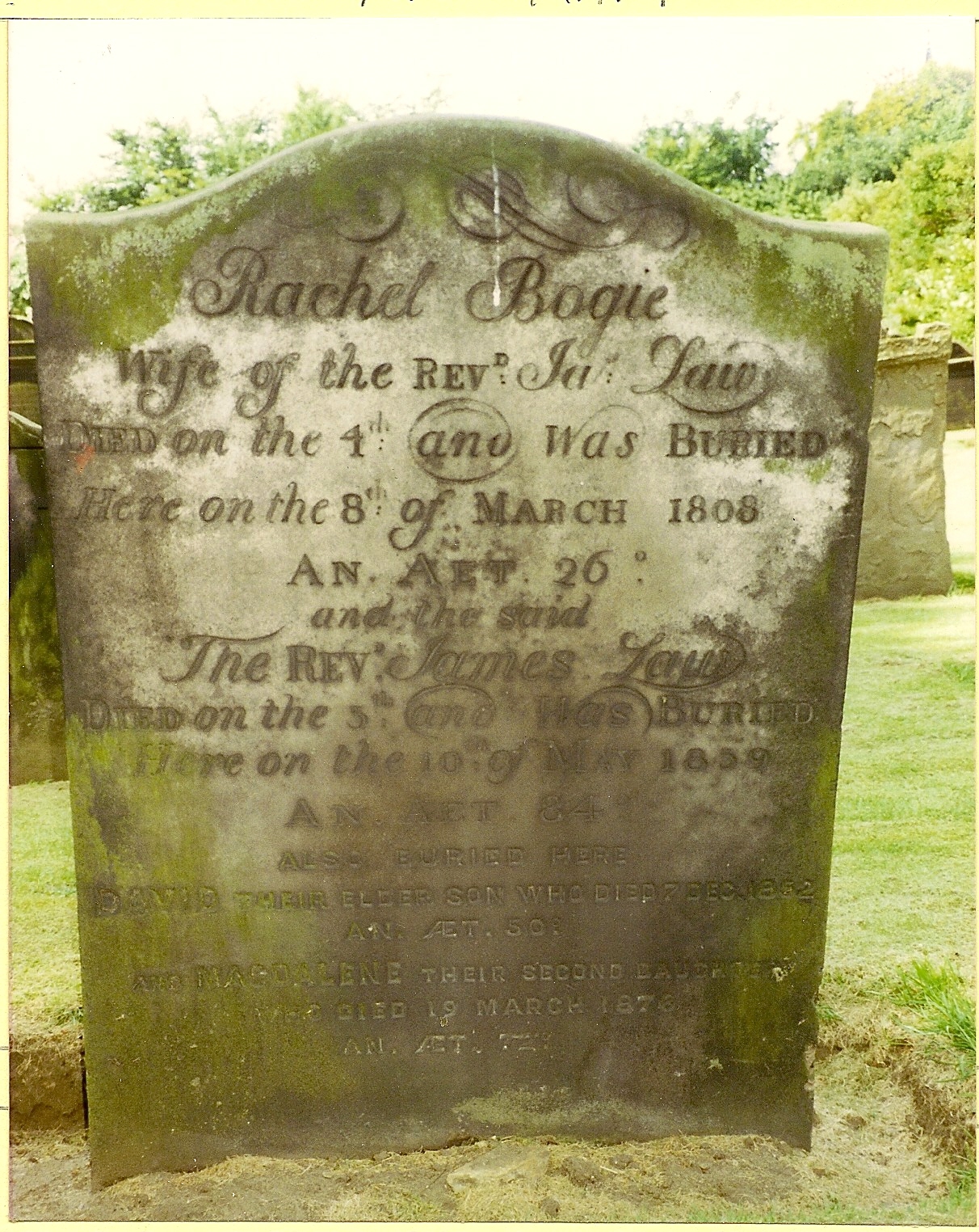 Inscription 1 | RACHEL BOGIE WIFE OF THE REVD. JAS LAW DIED ON THE 4TH AND WAS BURIED HERE ON THE 8TH OF MARCH 1808 AN AET 26 o. AND THE SAID THE REVD JAMES LAW DIED ON THE 5TH AND WAS BURIED HERE ON THE 10TH OF MAY 1859 AN AET 84 o. ALSO BURIED HERE DAVID THEIR |