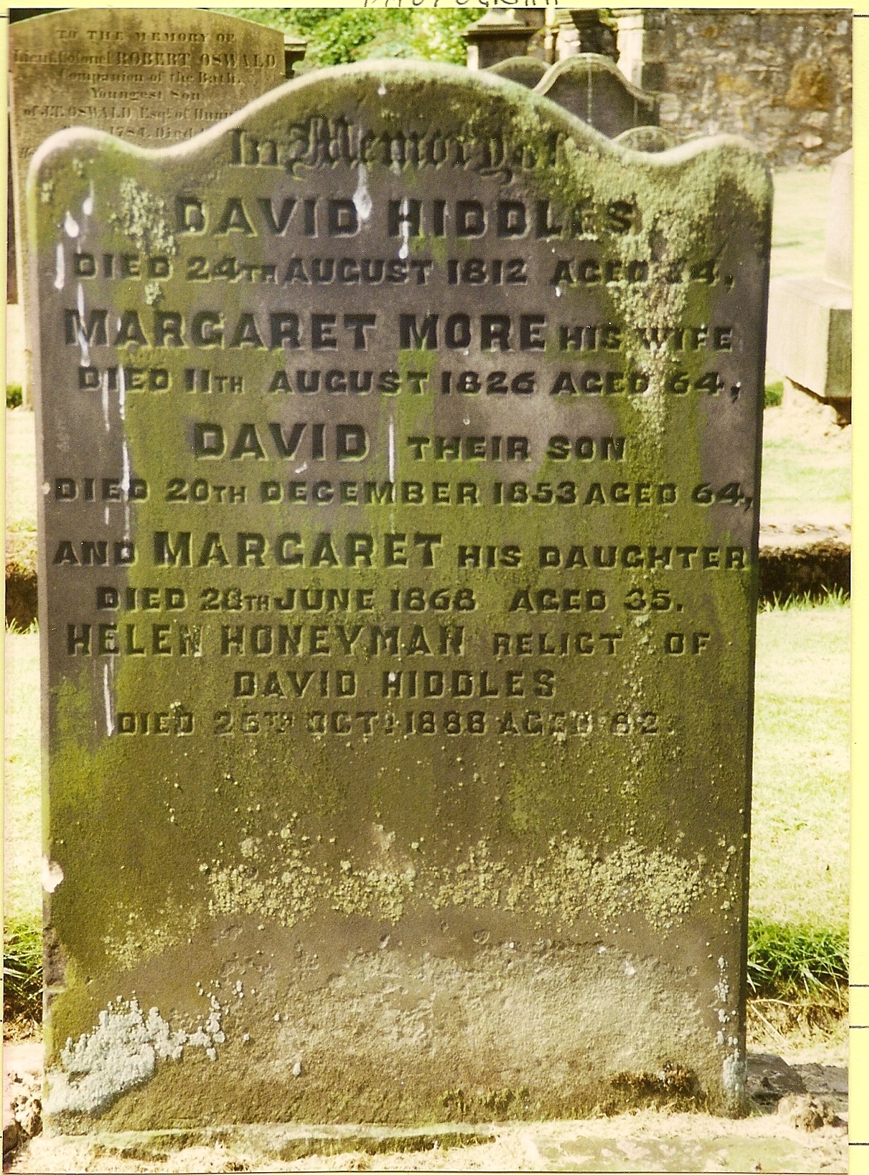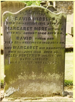 Inscription 1 | IN MEMORY OF DAVID HIDDLES DIED 24TH AUGUST 1812 AGED 54 MARGARET MORE HIS WIFE DIED 11TH AUGUST 1826 AGED 64 DAVID THEIR SON DIED 20TH DECEMBER 1853 AGED 64 AND MARGARET HIS DAUGHTER DIED 28TH JUNE 1868 AGED 35 |