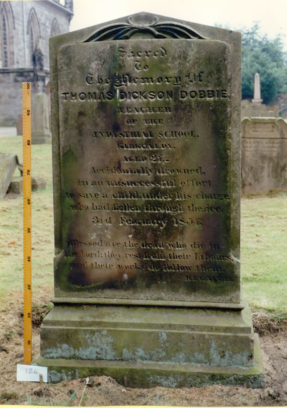 Inscription 1 | SACRED TO THE MEMORY OF THOMAS DICKSON DOBBIE TEACHER OF THE INDUSTRIAL SCHOOL KIRKCALDY AGED 27 ACCIDENTALLY DROWNED IN AN UNSUCCESSFUL EFFORT TO SAVE A CHILD UNDER HIS CHARGE WHO HAD FALLEN UNDER THE ICE 3RD FEBRUARY 1857 |