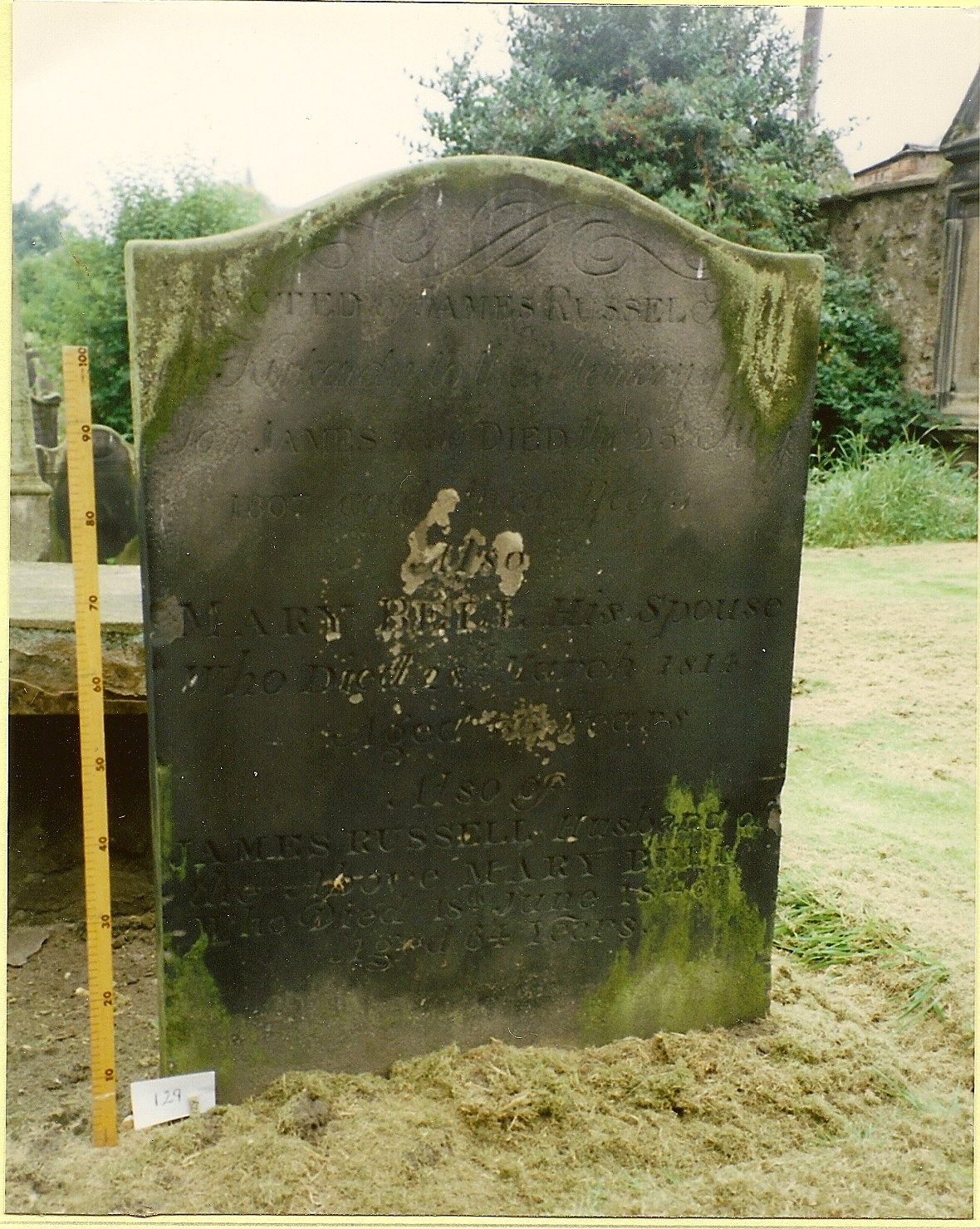 Inscription 1 | ERECTED BY JAMES RUSSEL SMITH IN KIRKCALDY TO THE MEMORY OF HIS SON JAMES WHO DIED 23RD JULY 1807 AGED THREE YEARS ALSO MARY BELL HIS SPOUSE WHO DIED 28TH MARCH 1814 AGED 36 YEARS ALSO OF JAMES RUSSELL, HUSBAND OF THE ABOVE MARY BELL WHO DIED |