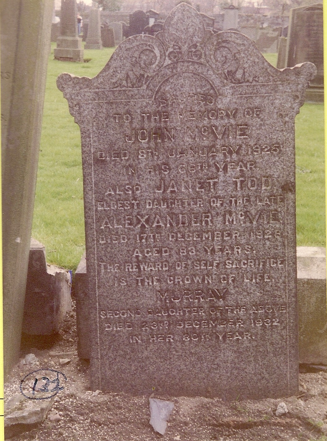 Inscription 1 | SACRED TO THE MEMORY OF JOHN McVIE DIED 8TH JANUARY 1925 IN HIS 66TH YEAR. ALSO JANET TOD, ELDEST DAUGHTER OF THE LATE ALEXANDER McVIE DIED 17TH DECEMBER 1928 AGED 83 YEARS. |