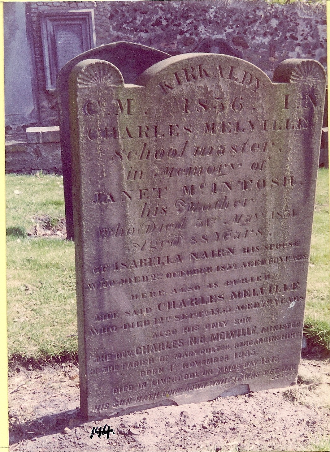 Inscription 1 | KIRKALDY C.M. 1856 I.N. CHARLES MELVILLE SCHOOL MASTER IN MEMORY OF JANET McINTOSH HIS MOTHER WHO DIED 31 MAY 1851 AGED 88 YEARS OF ISABELLA NAIRN HIS SPOUSE WHO DIED 2 OCTOBER 1822 AGED 60 HERE ALSO IS BURIED THE SAID CHARLES MELVILLE WHO |