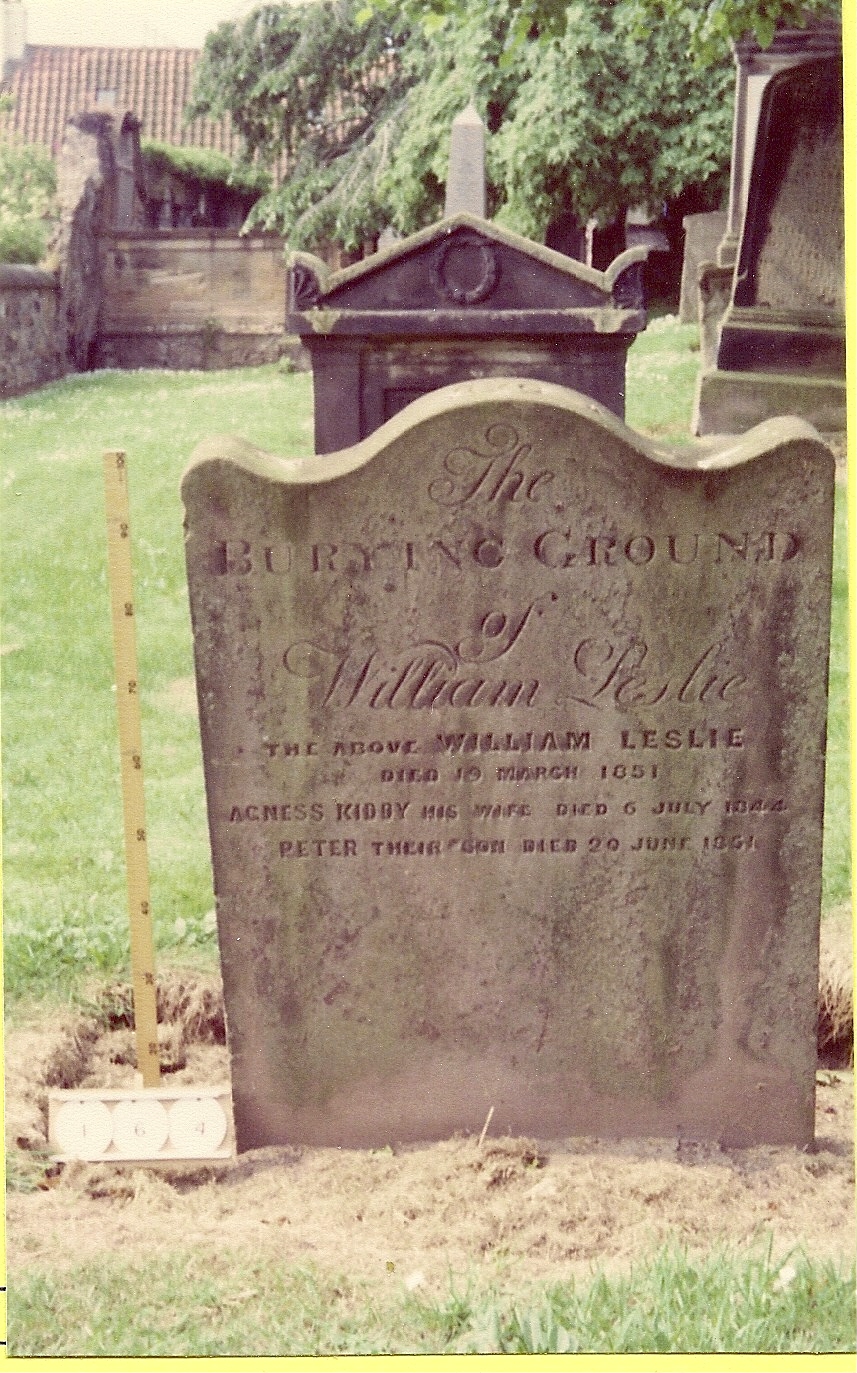 Inscription 1 | THE BURYING GROUND OF WILLIAM LESLIE THE ABOVE WILLIAM LESLIE DIED 19 MARCH 1851 AGNES KIDDY HIS WIFE DIED 6 JULY 1844 PETER THEIR SON DIED 20 JUNE 1851 |