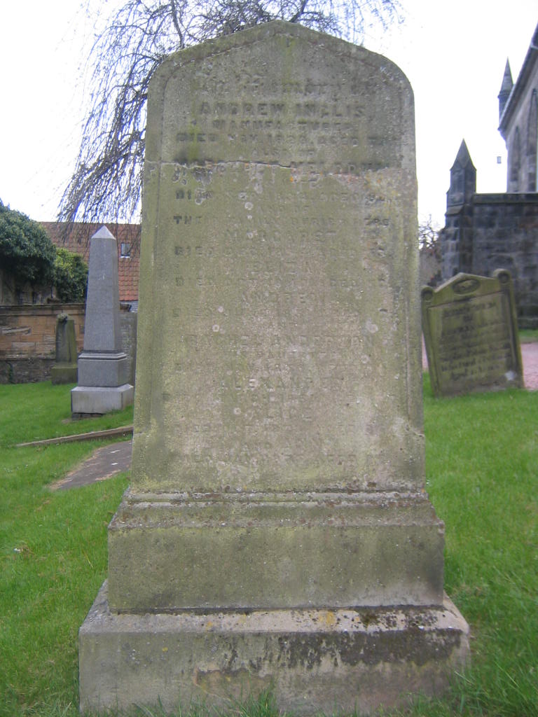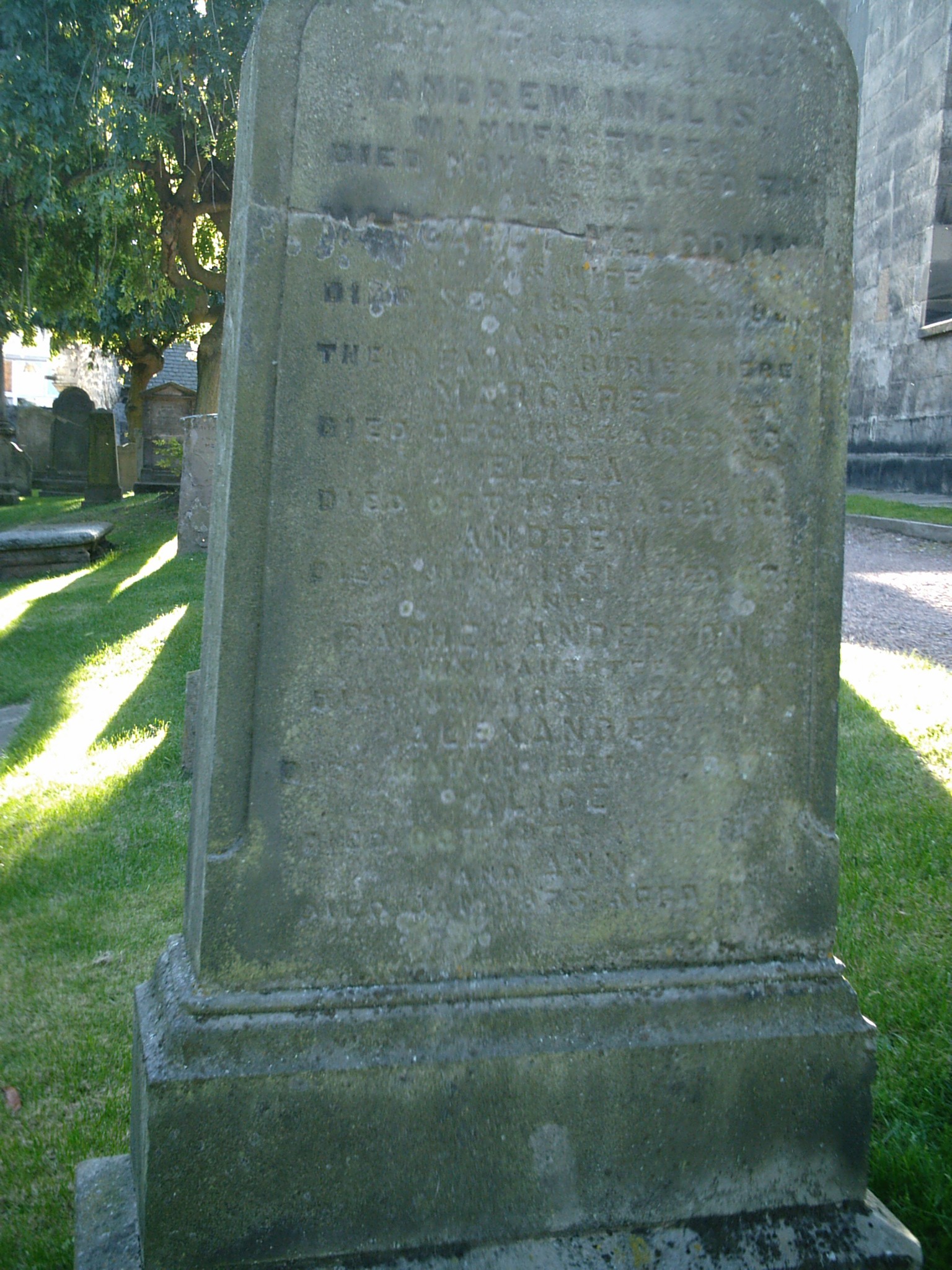 Inscription 2 | IN MEMORY OF ANDREW INGLIS MANUFACTURER DIED NOV 1828 AGED 73 ALSO OF MARGARET MELDRUM HIS WIFE DIED SEP 1834 AGED 80 AND OF THEIR FAMILY BURIED HERE MARGARET DIED DEC 1834 AGED 53 ELIZA DIED OCT 1840 AGED 50 ANDREW DIED JUNE 1851 AGED 67 AND RACHEL ANDERSON HIS DAUGHTER DIED NOVEMBER 1855 AGED 22 ALEXANDER DIED MARCH 1861 AGED 77 ALICE DIED OCT 1873 AGED 86 AND ANN DIED JAN 1875 AGED 86 |