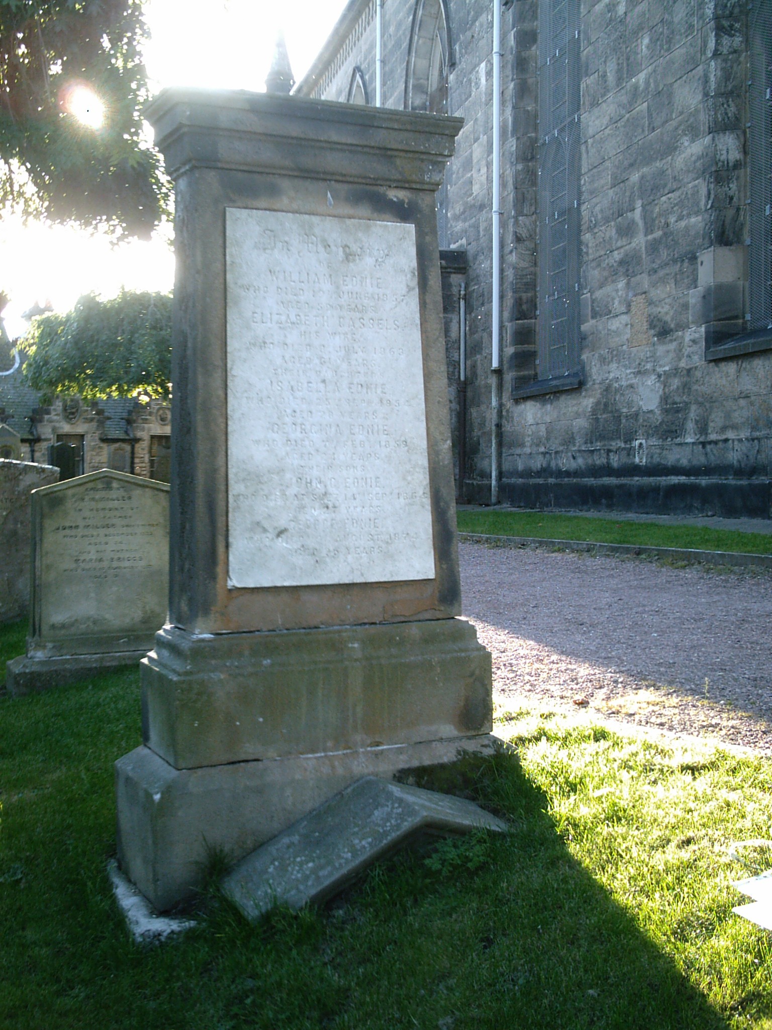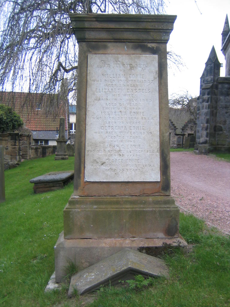 Inscription 2 | IN MEMORY OF WILLIAM EDNIE WHO DIED 19TH JUNE 1857 AGED 59 YEARS ELIZABETH CASSELS HIS WIFE WHO DIED 3RD JULY 1863 AGED 61 YEARS THEIR DAUGHTERS ISABELLA EDNIE WHO DIED 25TH SEPR 1854 AGED 28 YEARS GEORGINA EDNIE WHO DIED 7TH FEBY 1859 AGED 24 YEARS THEIR SONS JOHN C EDNIE WHO DIED AT SUEZ 14TH SEPR 1864 AGED 27 YEARS GEORGE EDNIE WHO DIED 19TH AUGUST 1874 AGED 35 YEARS |