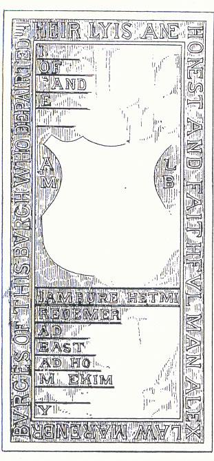 Inscription 2 | Testaments show this dates from 1617. Inscription around margins: HEIR LYIS ANE HONEST AND FAITHFUL MAN ALEX LAW MARENER BURGES OF THIS BURGH WHO DEPAIRTED (see photograph) |