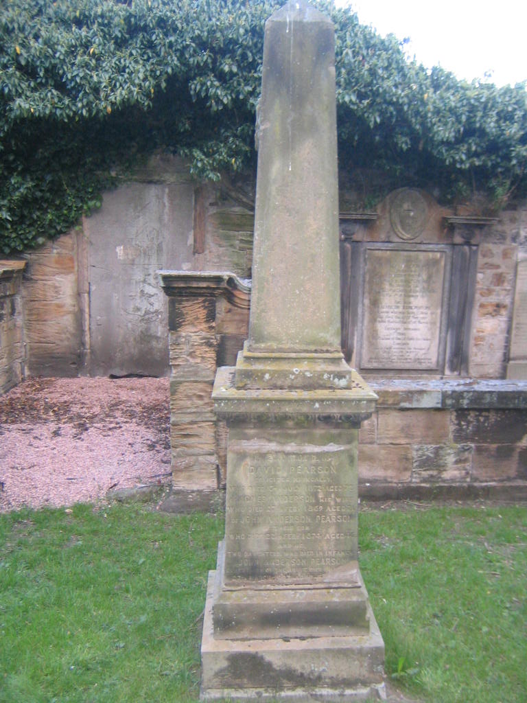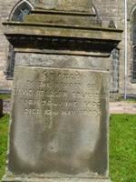 Inscription 2 | MARGARET KIRK fourth daughter who died 19th June 1875 aged 10 months. (North Face:) In memory of DAVID PEARSON, SOLICITOR, KIRKCALDY, who died 15th July 1872 aged 72 of AGNES ANDERSON his wife, who died 27th Feb 1869 aged 71 of JOHN ANDERSON PEARSON their son who died 22nd Feby 1874 aged 46 and of two daughters who died in infancy JOHN ANDERSON PEARSON eldest son of the above died in . . . 27th March 1887 aged 6-- (corner of stone damaged here) (South Face:) Sacred to the memory of DAVID PEARSON, SOLICITOR BORN 26TH June 1832 DIED 13th May 1889 (on base facing East: "Not lost but gone before.") AS PER OLD RECORD NO 10 David Pearson solicitor here 15.7.1872 72, w Agnes Anderson 27.2.1869 71, s John Anderson P. 22.2.1874 46, two das inf, 1s John Anderson P. d London 27.3.1887 61 (incompatibility of ages not understood);David P. solicitor 26.6.1832 13.5.1889, 2s Arthur Francis 24.9.1872 4 1/2, 3da Augusta Blanche 29.1.1874 3 1/4, 4da Margt Kirk 19.6.1875 10m. |