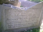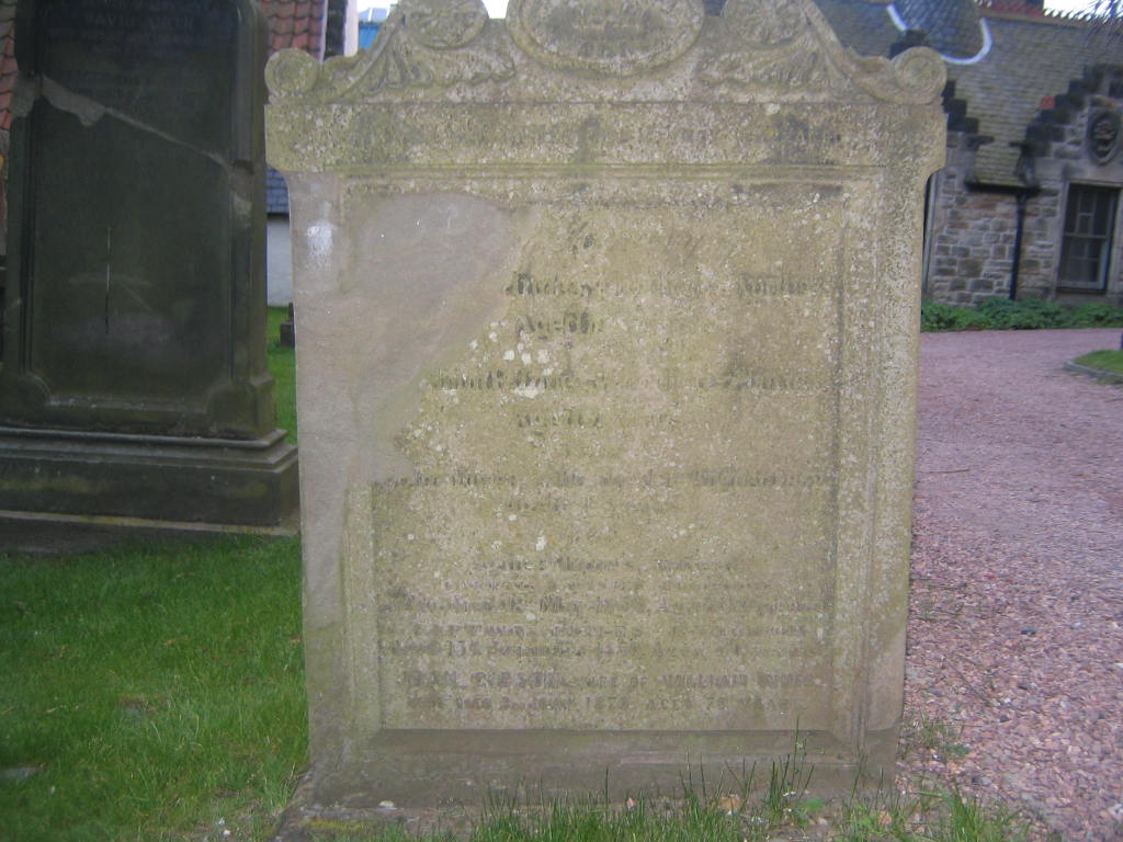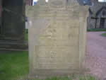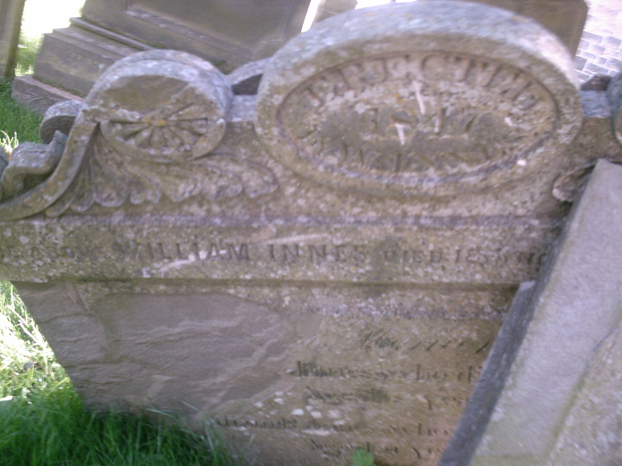 Inscription 2 | ERECTED 1847 BY W. INNES THE ABOVE WILLIAM INNES DIED 18TH NOVR 1872 AGED 81 YEARS MEMORY . . . INNES who died 9th April 1835 aged 18 1/2yrs . . . LLIAM P. INNES who died 27th Jan 1842 aged 21 years and . . . . . . Who die JOHN MOYES . . . D 2nd August 1852 aged 4 years also AGNES INNES, wife of CAPTAIN JAMES BULLOCH who died 18th May 1858, Aged 34 years CAPTAIN JAMES BULLOCH died 15th January 1859, Aged 40 years JOAN GIBSON, wife of William Innes who died 3rd May 1873, Aged 79 years (bottom half of memorial still in ground, top half leaning against it) |