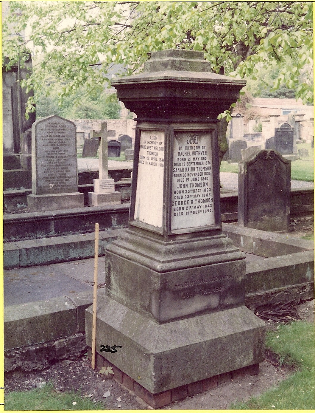 Inscription 1 | IN MEMORY OF RACHEL RUTHVEN BORN 21 MAY 1801 DIED 12 SEPTEMBER 1876 SARAH NAIRN THOMSON BORN 30 NOVEMBER 1836 DIED 19 JUNE 1840 JOHN THOMSON BORN 25TH DECR 1803 DIED 23RD MAY 1885 GEORGE R. THOMSON BORN 21ST MAY 1842 DIED 13TH DECR 1890 |