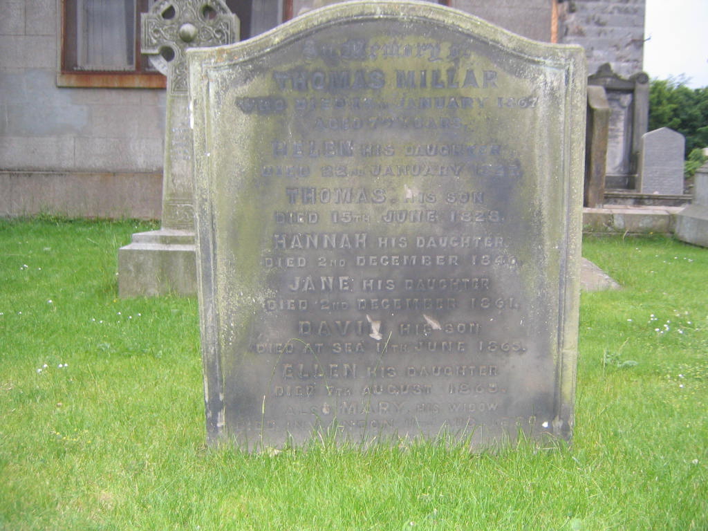 Inscription 1 | IN MEMORY OF THOMAS MILLAR WHO DIED 14TH JANUARY 1867 AGED 79 YEARS. HELEN HIS DAUGHTER DIED 22ND JANUARY 1827, THOMAS HIS SON DIED 15TH JUNE 1828, HANNAH HIS DAUGHTER DIED 2ND DECEMBER 1846, JANE HIS DAUGHTER DIED 2ND DECEMBER 1861, |