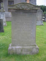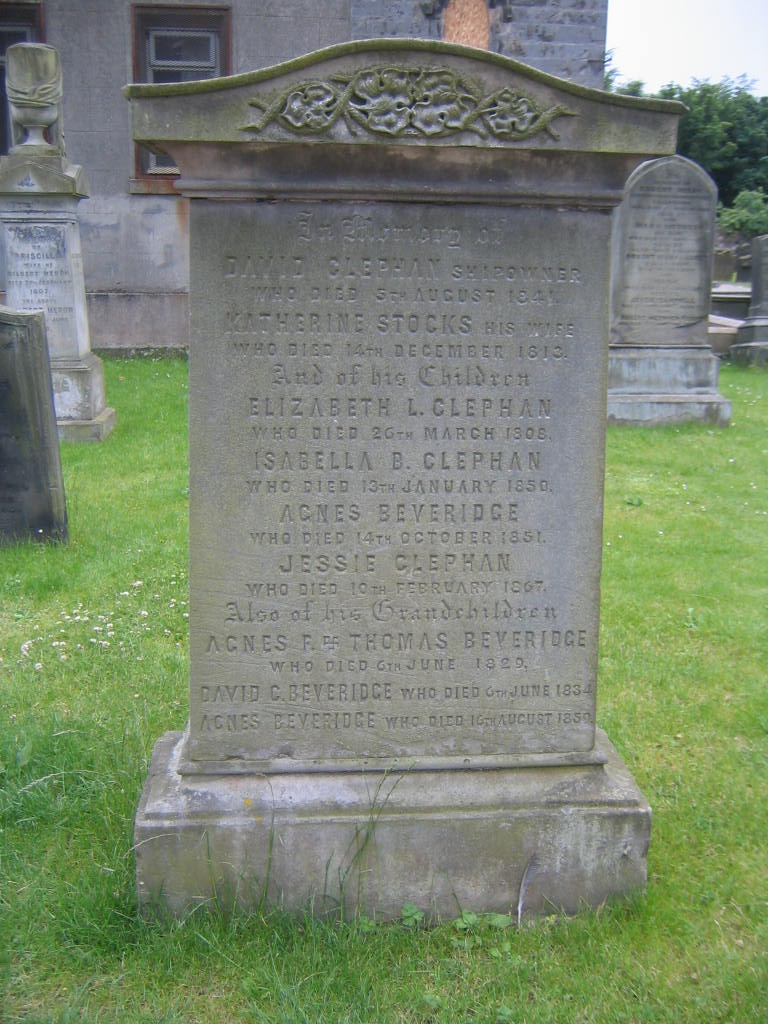 Inscription 2 | ISABELLA B. CLEPHAN WHO DIED 13TH JANUARY 1850, AGNES BEVERIDGE WHO DIED 14TH OCTOBER 1851, JESSIE CLEPHAN WHO DIED 10TH FEBRUARY 1867. ALSO OF HIS GRANDCHILDREN AGNES F & THOMAS BEVERIDGE WHO DIED 6TH JUNE 1829, DAVID C BEVERIDGE WHO DIED 6TH JUNE 1834 AGNES BEVERIDGE, WHO DIED 16TH AUGUST 1859 (NOTES: - Agnes F and Thomas Beveridge, 5yrs and 3 yrs old died same day. - decorative ivy carved on lintel - 'A's have no cross on them) |