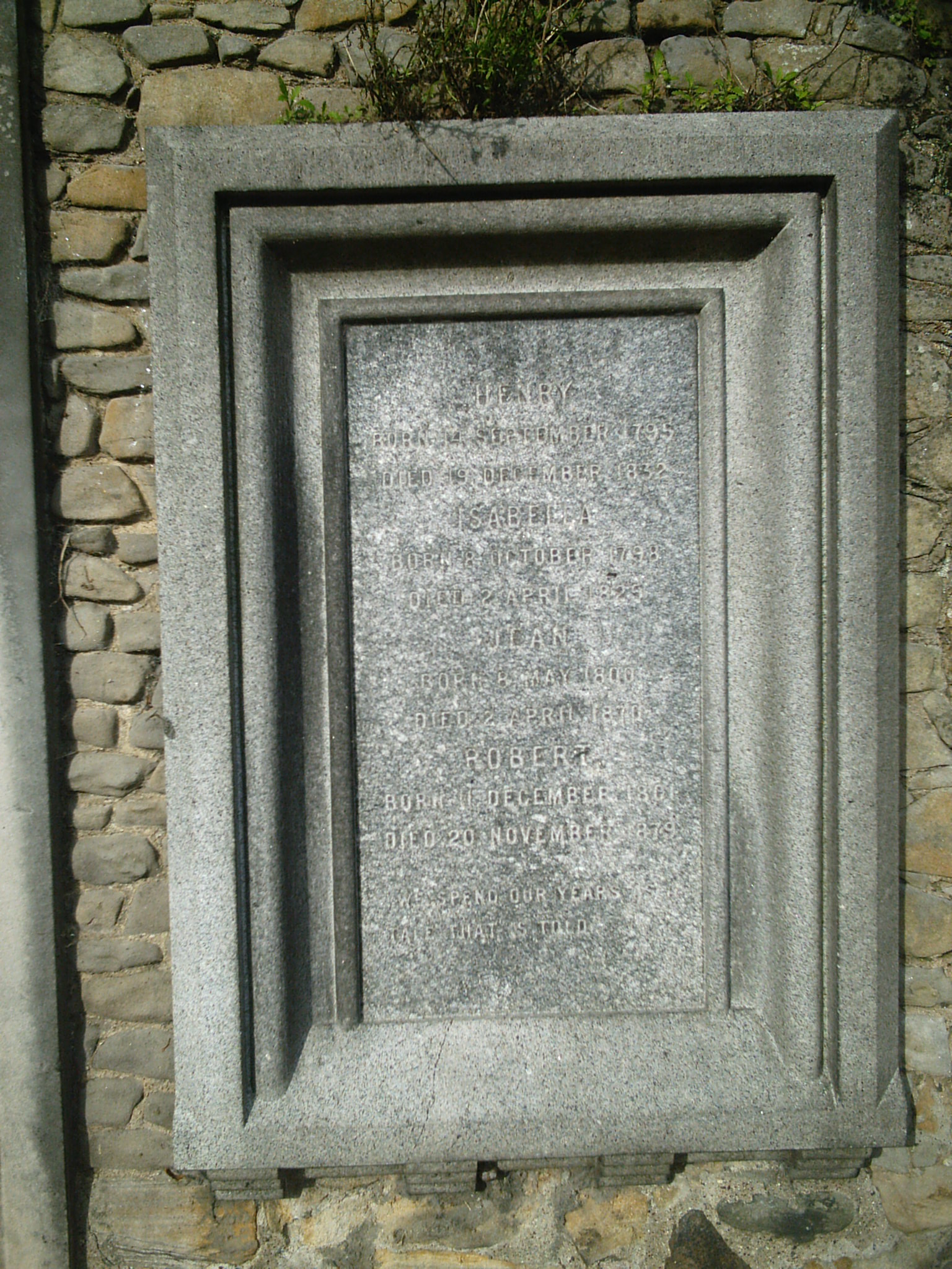Inscription 1 | HENRY Born 14 September 1795 Died 19 December 1832. ISABELLA Born 8 October 1798 Died 2 April 1825 JEAN Born 8 May 1800 Died 2 April 1870. ROBERT Born 11 December 1801 Died 20 November 1879. We spend our years as a tale that is told. |