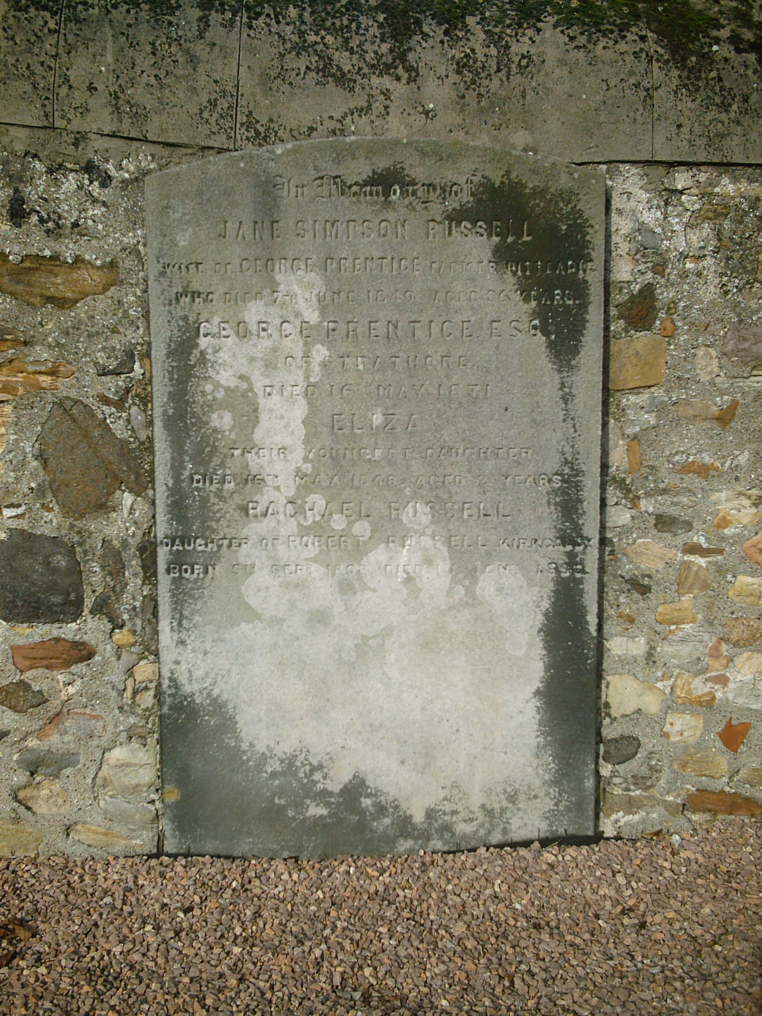 Inscription 1 | IN MEMORY OF JANE SIMPSON RUSSELL wife of GEORGE PRENTICE FARMER PITTEADIE who died 7th June 1849 aged 36 years. GEORGE PRENTICE ESQ of Strathore died 16th May 1871. |