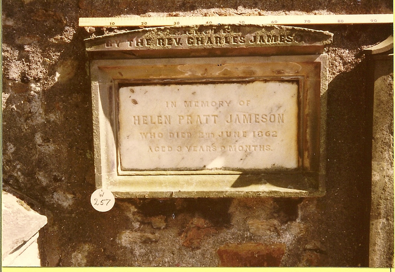 Inscription 1 | ERECTED BY THE REV. CHARLES JAMESON IN MEMORY OF HELEN PRATT JAMESON WHO DIED 2ND JUNE 1862 AGED 3 YEARS 9 MONTHS |