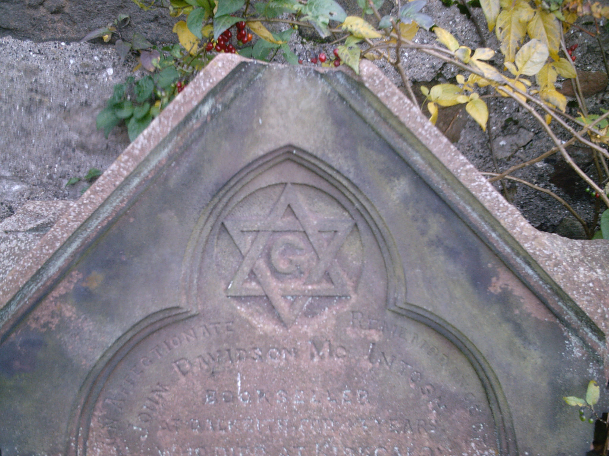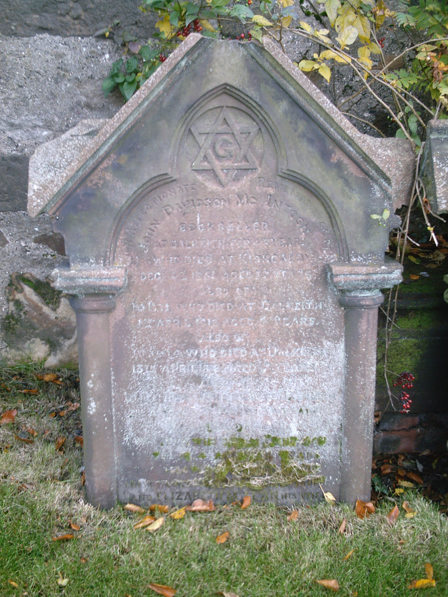 Inscription 1 | IN AFFECTIONATE REMEMBRANCE OF JOHN DAVIDSON McINTOSH BOOKSELLER AT DALKEITH FOR 44 YEARS WHO DIED AT KIRKCALDY DEC 6TH 1856 AGED 77 YEARS ALSO OF JOHN WHO DIED AT DALKEITH 1ST APRIL 1818 AGED 5 YEARS ALSO OF JESSIE WHO DIED AT DALKEITH |