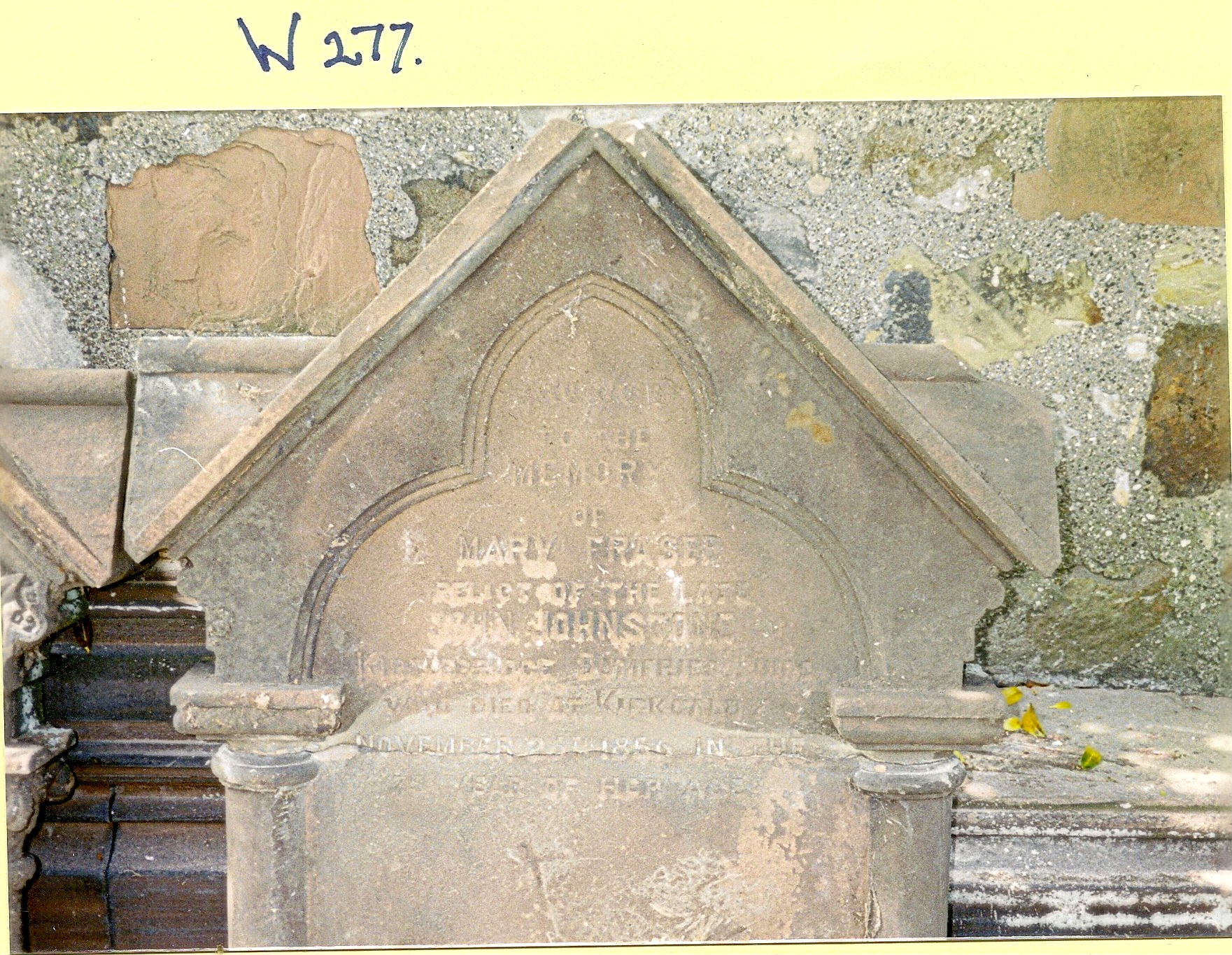 Inscription 1 | SACRED TO THE MEMORY OF MARY FRASER RELICT OF THE LATE JOHN JOHNSTONE KIRTLEBRIDGE DUMFRIESSHIRE WHO DIED AT KIRKCALDY NOVEMBER 26TH 1856 IN THE 75TH YEAR OF HER AGE |