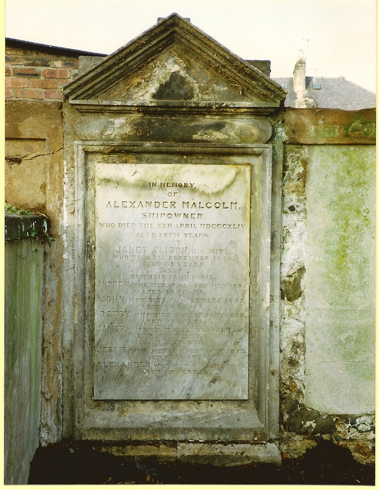 Inscription 1 | IN MEMORY OF ALEXANDER MALCOLM SHIPOWNER WHO DIED THE XXII APRIL MDCCCXLIV AGED LXXVI YEARS JANET ALISON HIS WIFE WHO DIED 19TH DECEMBER 1855 AGED 83 YEARS ALSO OF THE FAMILY VIZ. ANDREW WHO DIED AT SEA 30TH JULY 1835 AGED 35 YEARS |