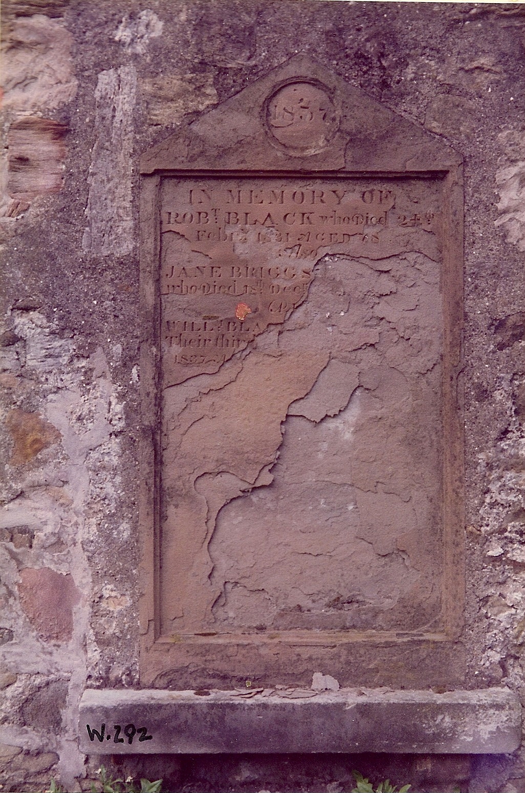 Inscription 1 | 1837 IN MEMORY OF ROBT. BLACK WHO DIED 24TH FEBRY. 1831 AGED 78 ALSO JANE BRIGGS WHO DIED 18TH DECEMBER 1834 AGED 77 WILLM. BLACK ------- THEIR THIRD (SON) (WM. WRITER 4TH JULY) 1837 --- |