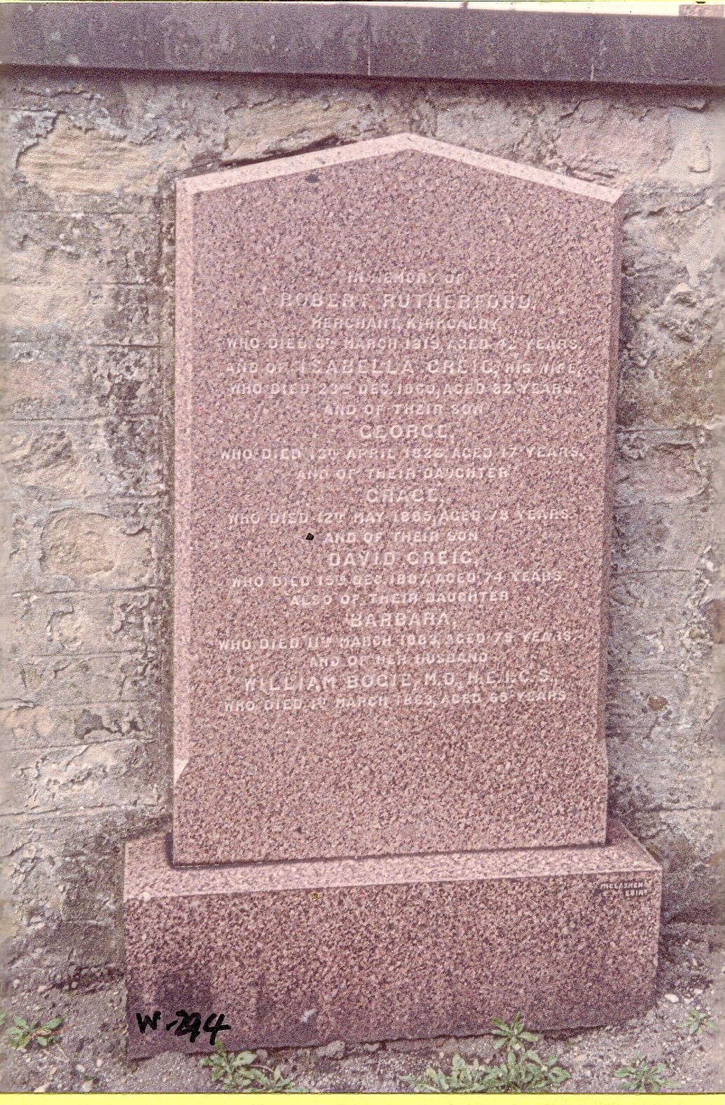 Inscription 2 | GRACE WHO DIED 12TH MAY 1885 AGED 78 YEARS AND OF THEIR SON DAVID GREIG WHO DIED 15TH DEC 1887 AGED 74 YEARS ALSO OF THEIR DAUGHTER BARBARA WHO DIED 11TH MARCH 1883 AGED 79 YEARS AND OF HER HUSBAND WILLIAM BOGIE M.D., M.C.I.C.S. WHO DIED 4TH MARCH 1863 AGED 65 YEARS |