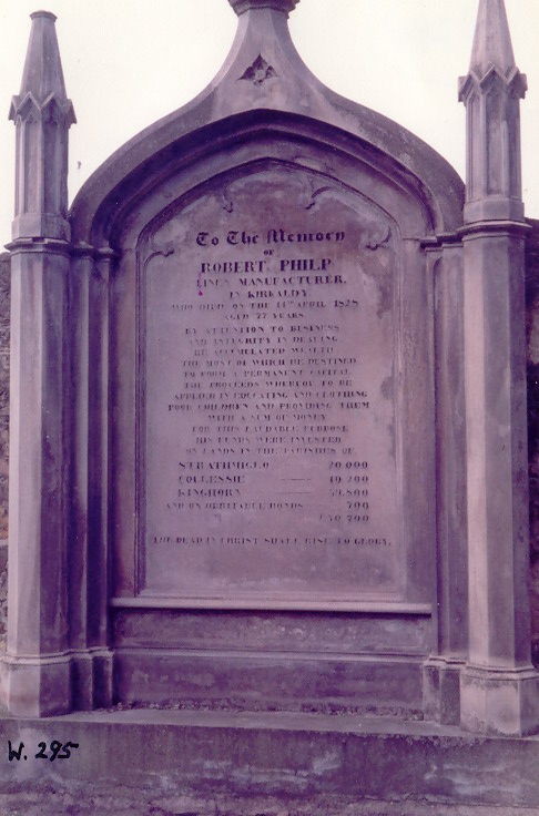 Inscription 1 | TO THE MEMORY OF ROBERT PHILP LINEN MANUFACTURER IN KIRKALDY WHO DIED ON THE 14TH APRIL 1828 AGED 77 YEARS BY ATTENTION TO BUSINESS AND INTEGRITY IN DEALING HE ACCUMULATED WEALTH THE MOST OF WHICH HE DESTINED TO FORM A PERMANENT CAPITAL |