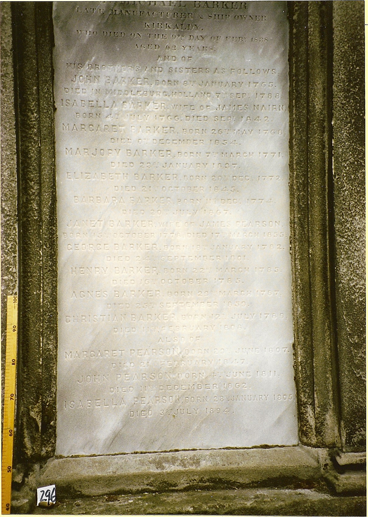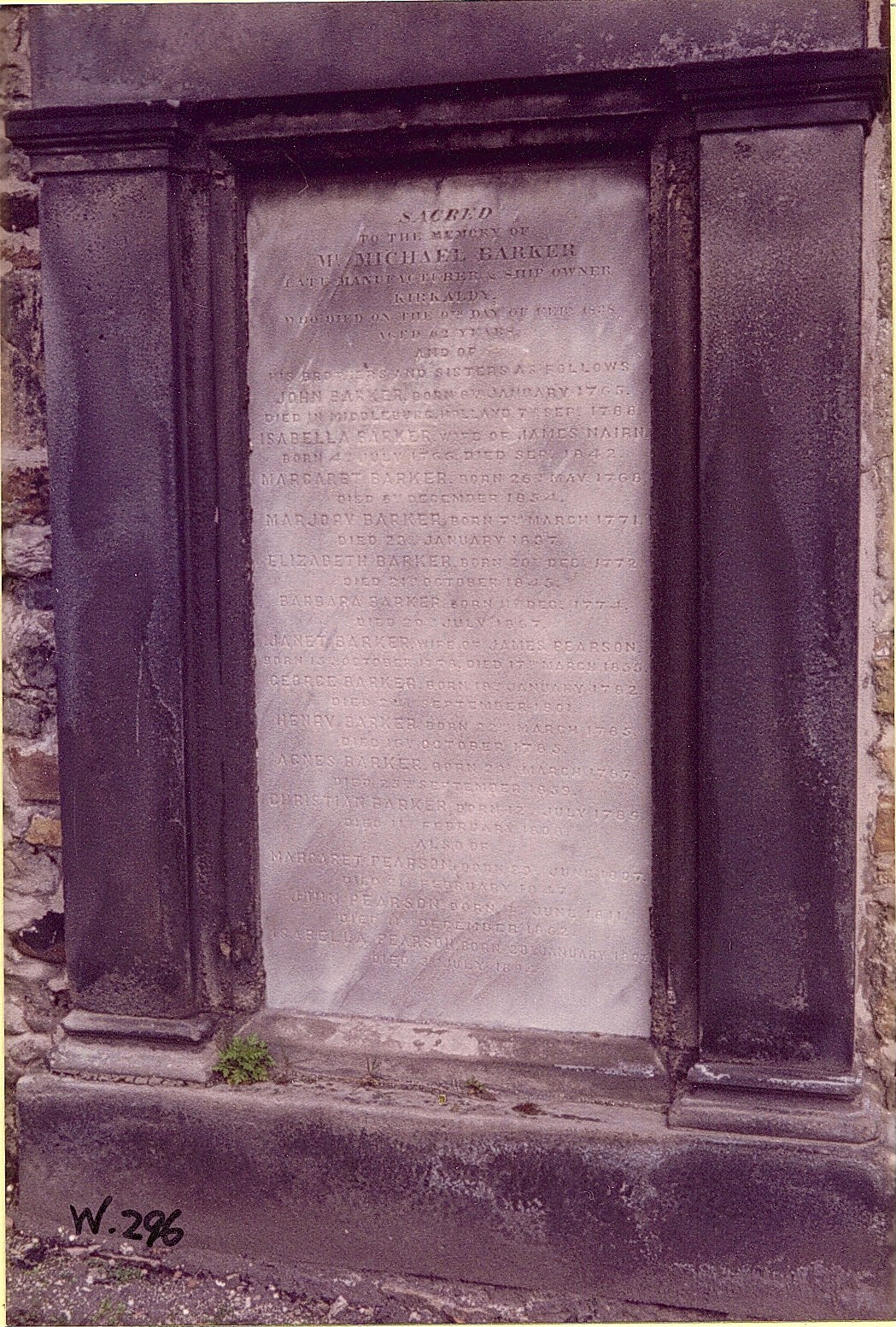 Inscription 1 | SACRED TO THE MEMORY OF MR. MICHAEL BARKER LATE MANUFACTURER & SHIPOWNER KIRKALDY WHO DIED ON THE 9TH DAY OF FEBY 1838 AGED 62 YEARS AND OF HIS BROTHERS AND SISTERS AS FOLLOWS JOHN BARKER BORN 8TH JAN 1765 DIED IN MIDDLEBURG, HOLLAND 7TH SEPT 1788 ISA |