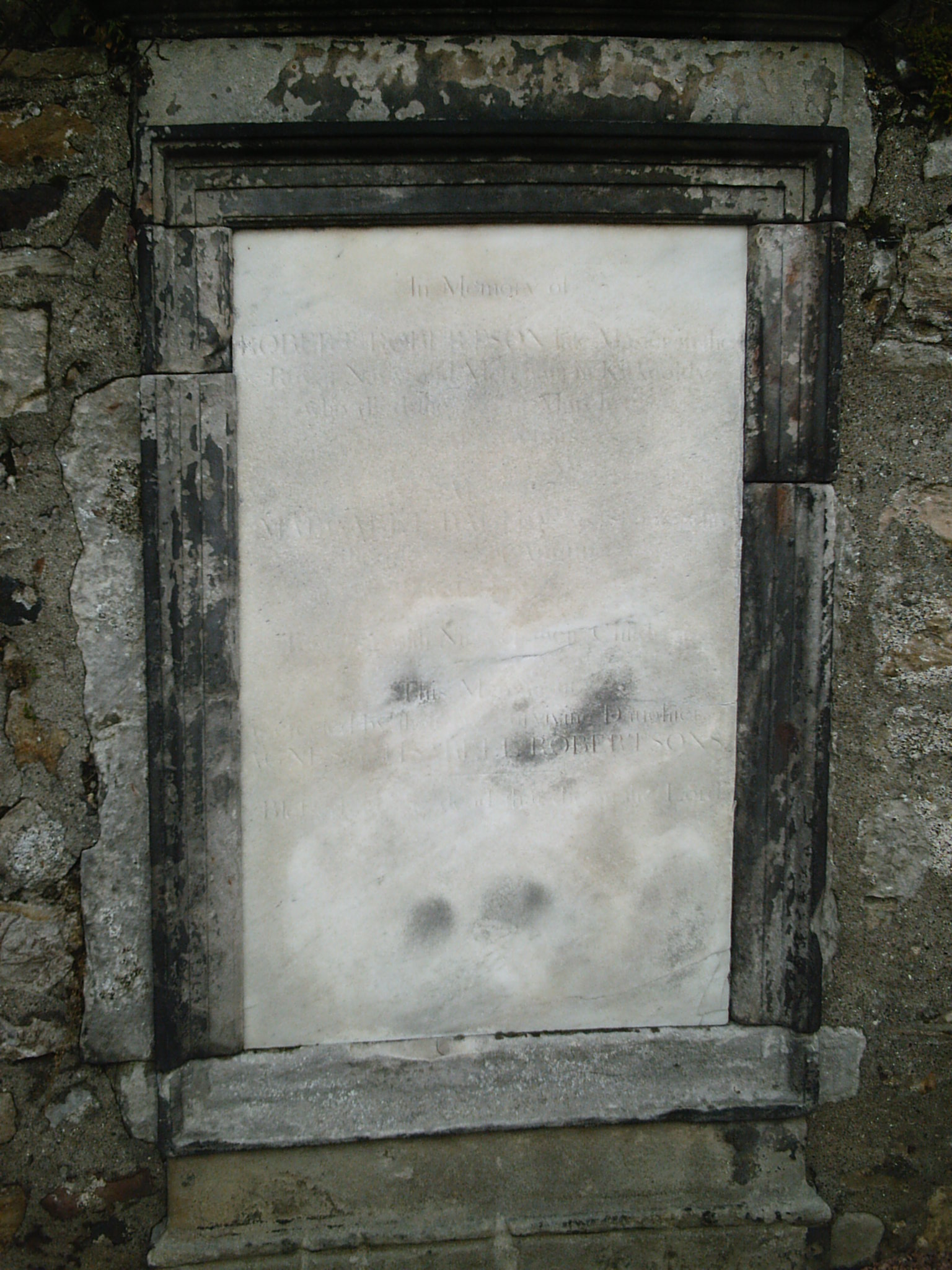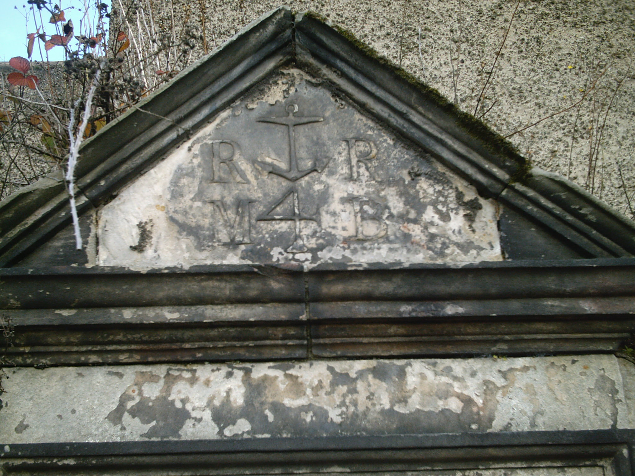Inscription 2 | (ANCHOR STYLE SYMBOL) R R M 4 B (NB: old Record No 253. Also Jervise: Robt Robertson late master RN and merchant here 24.3.1796 74, w Margt Bachop 25.8.1795 56, nine chn, by two surviving das Agnes and Isobell) |