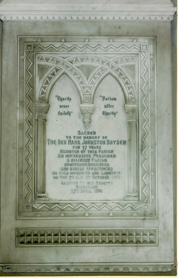 Inscription 1 | SACRED TO THE MEMORY OF THE REV. MARK JOHNSTON BRYDEN FOR 37 YEARS MINISTER OF THIS PARISH AN IMPRESSIVE PREACHER A DILIGENT PASTOR COURTEOUS DIGNIFIED AND KINDLY AFFECTIONED HE DIED HONOURED AND LAMENTED ON THE 7TH DAY OF OCTOBER 1880 |